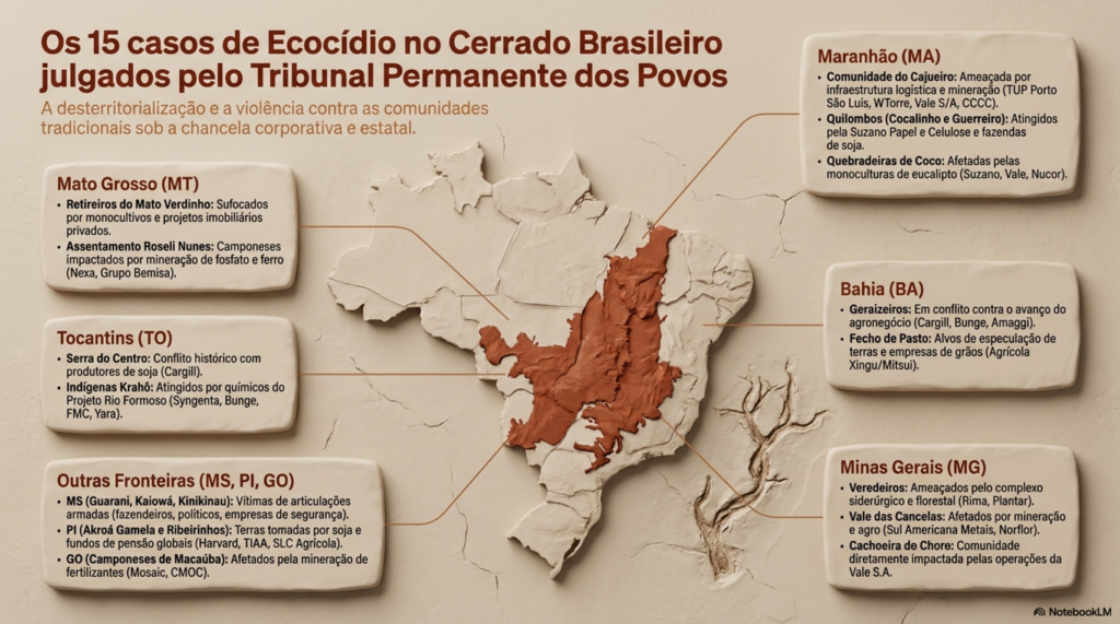 No Brasil, o enfrentamento ao ecocídio tem um marco relevante em 2019, com a Campanha Nacional em Defesa do Cerrado. Reunindo 56 movimentos sociais, a mobilização apresentou, em Roma, no Tribunal Permanente dos Povos (TPP), a denúncia de 15 casos de ecocídio e genocídio cultural distribuídos por oito estados brasileiros.