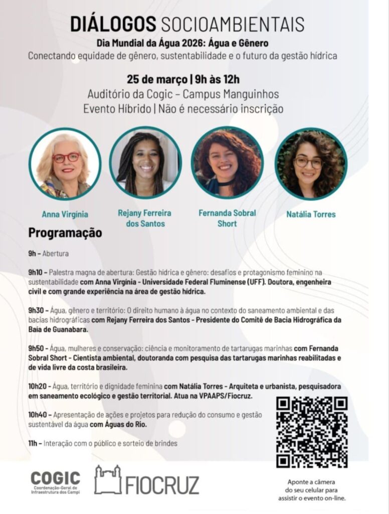 No evento “Diálogos Socioambientais – Dia Mundial da Água 2026: Água e Gênero”, organizado pela Coordenação Geral de Infraestrutura dos Campi (Cogic / Fiocruz) e realizado no dia 25 de março, as ‘Marias lata d’água na cabeça’ tiveram visibilidade. Com uma mesa composta apenas por mulheres, os diálogos conectaram equidade de gênero, sustentabilidade e o futuro da gestão hídrica. No eixo principal, os impactos causados a mulheres em condições precárias de vida num momento de crise ambiental global, agravados pelo descaso em relação a elas. O panorama geral enfatizou que o direito à água é indissociável das lutas por justiça social e representatividade feminina nos espaços de governança.