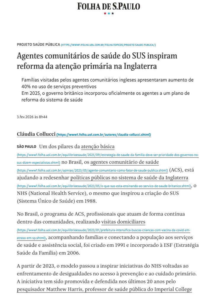 A importância dos agentes comunitários de saúde do SUS na reforma da atenção primária na Inglaterra é destacada no texto publicado em 3 de fevereiro