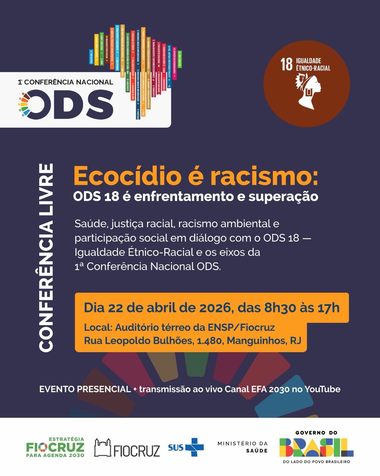 O ecocídio não está no Objetivo de Desenvolvimento Sustentável 18 (ODS 18) para a promoção da igualdade étnico-racial, adotado pelo governo Lula, em 2023, e sugerido à ONU para colocá-lo na Agenda 2030. Mas, a esperança aumenta de sua inclusão a partir de proposta concreta para aprovação a ser apresentada na Conferência Livre “Ecocídio é racismo: ODS 18 é enfrentamento e superação”, iniciativa da Estratégia Fiocruz para a Agenda 2030 (EFA 2030) e Vice-Presidência de Ambiente, Atenção e Promoção da Saúde (VPASPS) / Fiocruz . O evento, que acontecerá em 22 de abril, a partir das 8h30, no auditório térreo da Escola Nacional de Saúde Pública (Ensp) / Fiocruz, no Campus de Manguinhos, integra a 1ª Conferência Nacional dos ODS. A Conferência contará com integrantes da sociedade civil, coletivos, organizações, universidades, redes e grupos comunitários. Para alcançar a representatividade definida pela Conferência Nacional para os Objetivos de Desenvolvimento Sustentável CNODS), os organizadores da Conferência optam pela participação presencial, sujeita à lotação, do auditório térreo da Ensp, onde cabem 200 pessoas.
